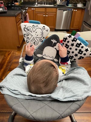 - Ocean-themed graphics and friendly sea creature characters keep interest high; simple black and white graphics and patterns on one side provide important visual stimulation during the early months and full-color scenes on the other side are great for months 3-6