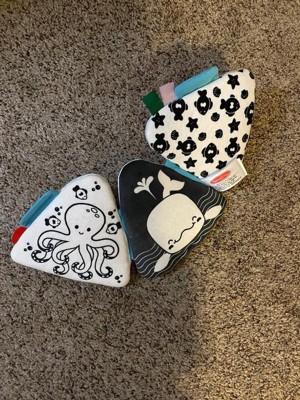 [This review was collected as part of a promotion.] This tummy time toy is completely adorable! It is dual sided with one side being bright and colorful, then the other side being black and white. We loved the under the sea theme that it had going on. I liked that you could lay it out flat or you could use the Velcro pieces and it’s a little triangle pop up. The colorful side has different engaging activities on each panel that will keep a baby entertained and engaged.