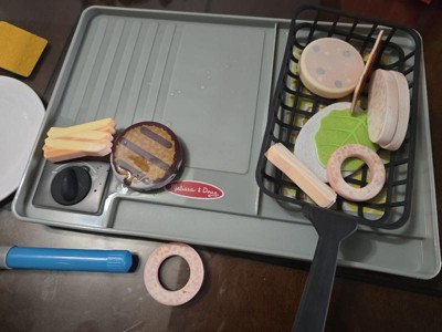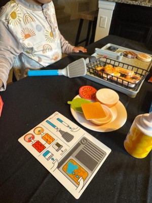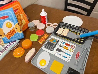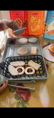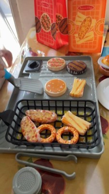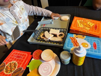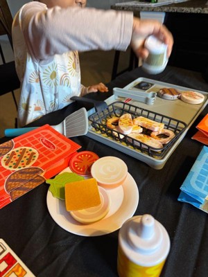 - Includes durable grill and fryer with clicking dial, fryer basket, water-dispensing spatula, condiment squeeze bottle, and salt and pepper shaker, 3 to-go bags, tongs, plate, double-sided reusable activity card; felt fried egg, bacon strip, cheese slice, lettuce, tomato