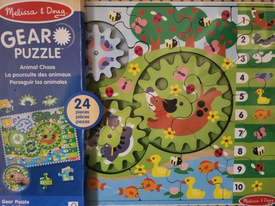 - Piece together an animal-themed 24-piece wooden jigsaw puzzle with 4 interlocking gears that spin