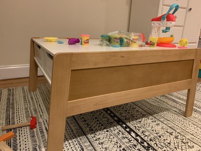 Really glad I took a chance on this table - the negative reviews were mostly about the assembly, not the finished product. It was definitely more assembly than I would have assumed for a piece this size, and to get everything to align perfectly I needed to loosen a bunch of screws, then tighten again at the end. The finished product - sturdy, attractive, and functional. I was expecting drawers, and the bins are so much better. Perfect height for my toddler, and guessing it’ll be a great size for a few years.