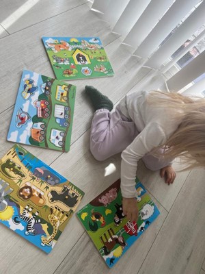 [This review was collected as part of a promotion.] My toddler loves these puzzles. They are sturdy and well made, as with most Melissa and Doug products. The illustrations are colorful and clear, my 2 year old had no problems taking apart and putting them back together. The pieces have pegs so it’s very easy for little hands, although storing them is a challenge since they’re not flat. My only critique is that the spaces where the puzzle pieces go have the same illustration as the puzzle piece itself so it’s not enough of a mental challenge for my toddler, any older and it would be way too easy. I wish they would have put a clue there or something like that. Otherwise, these puzzles are a great addition to any toddler’s toy collection!