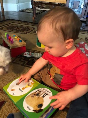 I Purchased the polkadot farm animal families for my one year-old grandson- he loves poking the little circles and making the pop noise- it's almost like bubble wrap for babies! After going through the book a few times he realizes which ones he has already pushed and which ones he hasn't. It is a book that he will sit and play with on his own as well. I even enjoy poking the dots!