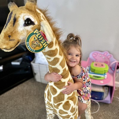 "The Melissa & Doug Giant Giraffe is an awe-inspiring plush companion that towers over 4 feet tall, making an unforgettable impression in any room. With lifelike details, realistic markings, and a soft, huggable body, this giraffe blends play and décor in one gentle giant. Wire-framed legs provide stability for posing, while surface-washable polyester fabric makes it easy to keep fresh through years of play. Whether as a nursery centerpiece, a whimsical playroom accent, or a beloved oversized cuddle buddy, this iconic giraffe sparks imagination, inspires storytelling, and brings safari spirit to kids and adults alike.