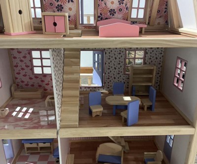 - Sturdy, spacious, and versatile wooden three-level, five room dollhouse with 19 pieces of wooden doll furniture, perfect for growing kids