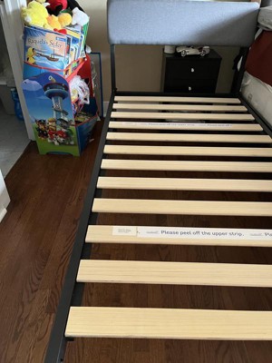 - • MELLOW MATERIALS: Made with 100-percent steel, the thick and round legs pair perfectly with non-slip solid wood slats to offer support and comfort. The upholstered headboard is filled with high-density, noise-free foam and covered in a modern gray fabric.
