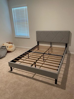 - Olena Upholstered Platform Bed Frame features light grey polyester upholstery and a diamond channel tufted headboard create a sophisticated, modern centerpiece for any bedroom