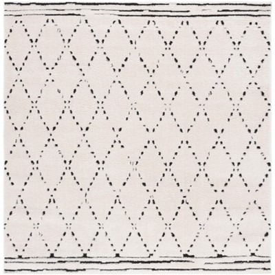 The rug features a bohemian style that brings a touch of eclectic charm to any room. It is adorned with an eye-catching ivory and black color palette, set in a bold, square shape that complements a variety of interior designs, from contemporary minimalism to rustic chic.