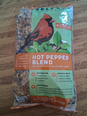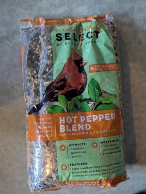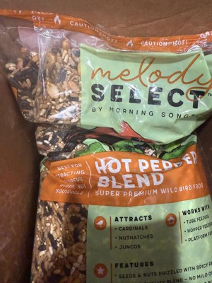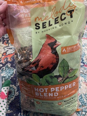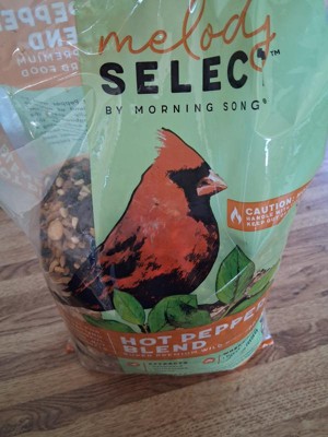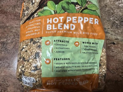 Melody Select Hot Pepper wild bird food is a zesty blend of hearty ingredients created to attract vibrant songbirds but send squirrels running the other direction. Spice up your feeder with this premium bird food blend of wild bird favorites featuring high-energy sunflower hearts, peanuts, and safflower seed seasoned with fiery hot pepper.