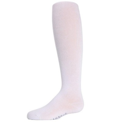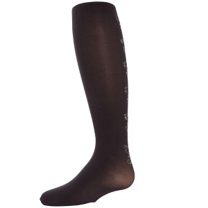 Plain in the front, statement-making in the back. Metallic, sparkly bows make their way down the back of these opaque tights from thigh to calf. Complementary, shimmering metallic thread is sure to catch the spotlight. Comfortable opaque tights are designed for day-long wear your little girl will love.