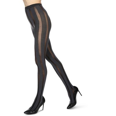 Let MeMoi's Line Luxe Tights light up your evening style. This opaque tight features a vertical stripe pattern, highlighted with lurex thread to create a soft metallic glow throughout. A sheer control top panel contrasts the stripe design creating a thigh-high stocking look. Rock it with your favorite mini and cigarette heels.