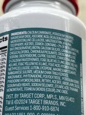calcium carbonate, potassium chloride, magnesium oxide, ascorbic acid, dicalcium phosphate, microcrystalline cellulose, maltodextrin, dl-alpha tocopheryl acetate, starch. contains <2% of beta-carotene, bht (preservative), biotin, calcium silicate, carnauba wax, cholecalciferol, chromium picolinate, croscarmellose sodium, crospovidone, cupric sulfate, cyanocobalamin, d-calcium pantothenate, fd&c blue no. 2 lake, fd&c red no. 40 lake, fd&c yellow no. 6 lake, folic acid, hydroxypropyl methylcellulose, lutein, lycopene, magnesium stearate, manganese sulfate, medium chain triglycerides, niacinamide, phytonadione, polydextrose, potassium iodide, pyridoxine hydrochloride, retinyl acetate, riboflavin, silica, sodium molybdate, sodium selenate, stearic acid, thiamine mononitrate, titanium dioxide (color), zinc oxide.