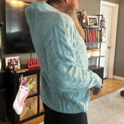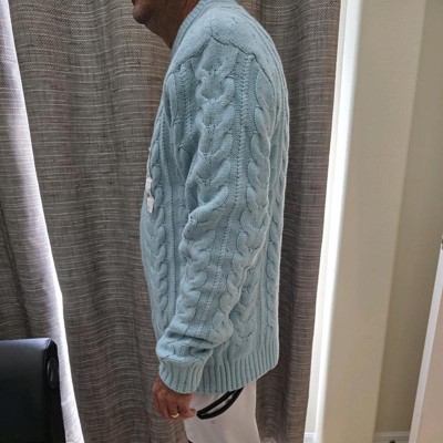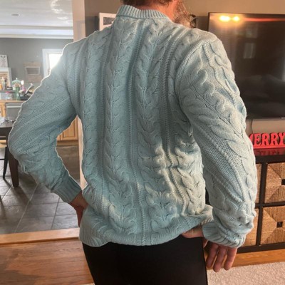 [This review was collected as part of a promotion.] My husband tried this sweater in a size Medium and it definitely looks good on the hanger. It runs a little big but if you are planning on wear a thick shirt underneath that could be ok. The material was not comfortable and was itchy. Additionally it didn't feel like it would hold up over time. The light blue color was nice and different than what you normally see for sweaters in the winter