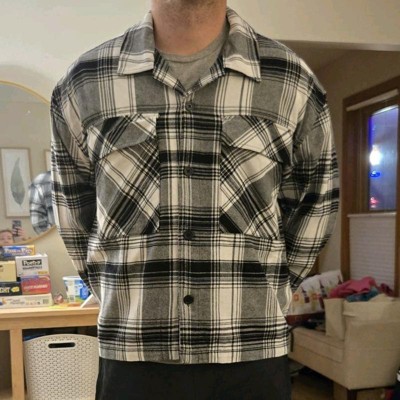 [This review was collected as part of a promotion.] I got this shirt for my husband to wear on cooler evenings. I got a size medium which is is his normal size and it fit nicely. It is an oversized fit which is great to wear something underneath. The plaid style goes nicely with jeans. He didn't love the cropped style but it does look nice. Overall this is a nice shirt that fits well.