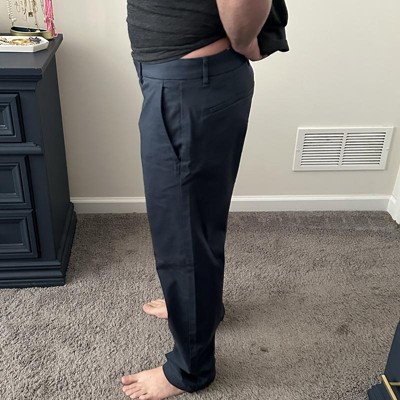 These chinos are great! Not too tight and not too baggy. Material feels nice and soft, too. Easy to care for, also. This particular version is my go too style for now on and will get more of these for sure!