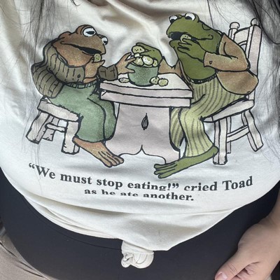 Relive the heartwarming tales of Frog and Toad with the Men's Short Sleeve Graphic T-Shirt - Tan. Crafted from soft material with a crew neck and short sleeves, this tee offers both comfort and style. The delightful Frog and Toad print, complete with the humorous phrase "We must stop eating! cried Toad as he ate another," adds merriment to your everyday wardrobe. Let the joy of these beloved characters brighten your day with the Men's Frog and Toad Graphic T-Shirt - Tan.