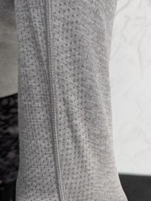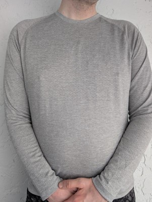 This Men's Long Sleeve Seamless T-Shirt from All In Motion in Heather Gray is pretty comfortable and feels light but its not quite as light or as breathable as other sun shirts or hoodies I have. The seamless design is nice and and gives a unique look, but the look of all the holes is a bit off putting for my tastes. It washes well and doesn't hold body odor like some other shirts made of similar materials, it seems relatively water wicking as well which is good.