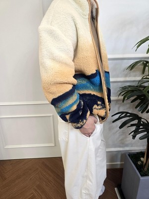 Love this fun Sherpa zip shirt/jacket. Great fit and fun design. Lots of compliments. It is too lightweight to wear alone in very cold weather but it is perfect for California winter weather.