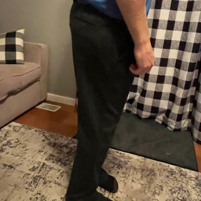 [This review was collected as part of a promotion.] My husband was trying on a size 30 x 32 which is typical for him. Overall, he is five foot eight inches and the trousers were the perfect length. Further it was a little tight around the waist. If you zoom into the trouser, you can see a little design which honestly makes it look like it was made with superior fabric. It did not itch or feel warm, so he could definitely wear it indoors at work.