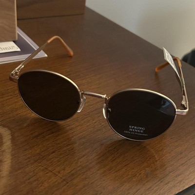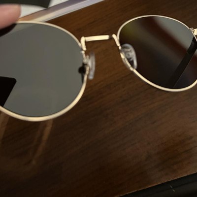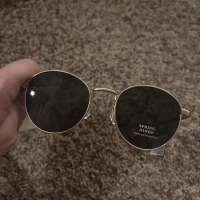 Sport a stylish sunny-day look with the Round Metal with Spring-Hinge Sunglasses from Goodfellow & Co™. These round sunglasses feature a gold-tone frame with gray lenses for appealing contrast you'll love. Designed with a metal frame, these sunglasses are designed with UV protection lenses to help keep your eyes shielded from the sun. Plus, they also feature a spring-hinged temple and nose pads for comfortable wear.