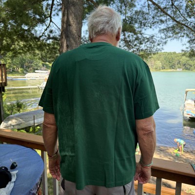 [This review was collected as part of a promotion.] I purchased this Graphic T-shirt for my dad. He is 6‘6“ tall and 250 pounds. I purchased this in a size 2 XL and it fit perfectly. The shirt is short sleeved and has a round neck line. The shirt is very soft and can easily be washed and dried for maintenance. The shirt is a nice color green with white writing on the front chest. This goes great with any type of shorts or jeans that you would want to pair it with. I received an incentive to write this review.