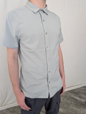 This men's short sleeve shirt made of 72% recycled poly, 20% cotton and 8% spandex with just a little visual color variation is great for casual day at the office or a summer day at the beach. That small amount of spandex gives it the softness and just a little stress. Well made seaming and complementing button allow this to be your go to dress up shirt for any occasion, easy wash and no wrinkle you can throw it in your suitcase and when you get there pull it out and it will be ready to wear.