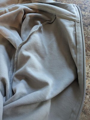 I like this jacket because it has a hood and full zip.The material is very soft and lightweight. It has zip pockets which helps keep items inside. Also, the length is perfect. I like the soft gray color as it goes with all colors.