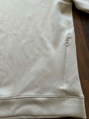 Quite a nice hoodie. My husband took off with it before I could even get a great photo, so I have to do with the ones he took. The color is nice cream. The material is that athletic type feel, so it isn’t super soft. The kind of material that a hang nail can get caught on, but perfect for him to wear while he’s running this Fall. Definitely a good affordable option. And it has zippered pockets!