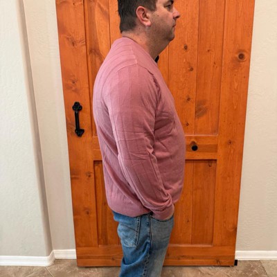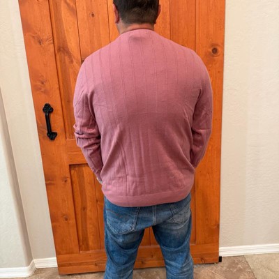 [This review was collected as part of a promotion.] This men’s sweater is a soft knit type material. This sweater is photographed in a size large and is true to size. This sweater is a crew style and is in the color of mauve. The material is very thin and lightweight. This sweater is breathable and won’t make you extra hot. I love how this fits in all the right places.