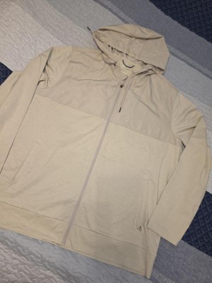 This jacket is very soft and feels luxury, similar to Vuori or Lululemon! I’d say it runs a bit on the small side - my husband typically wears a medium, sometimes large. He chose this in a large and it fits perfectly. The product description isn’t great - this was listed as gray, but it’s definitely a cream/beige color.