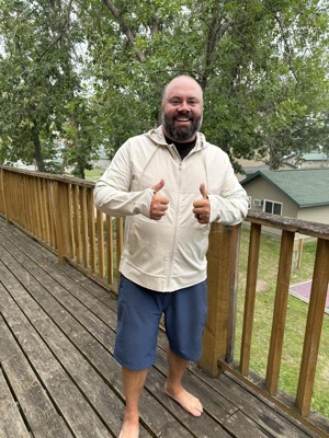 My 45 year old husband liked this jacket a lot. He says it is soft and he likes the thumb holes and appreciated there are zippers on the pockets (so stuff doesn’t fall out of pockets on roller coasters). He also appreciates the metal ending part of the strings. Even though the tag says light gray he feels it is more of a cream or khaki color.