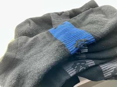 A: The socks are made from 81% recycled polyester, 10% nylon, 7% polyester, and 2% spandex.