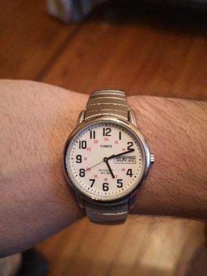 I always liked the expsnsion Band Makes it easy to move out of thr wsy ehile doing chores. The Watch keeps time for years before needing a battery to last even more years. If you have bad eye-sight get the White dial face, easier to read. If you are old enough to remember: TIMEX = It Takes a Licken' and Keeps On Ticken' - John Cameron Swayze So True