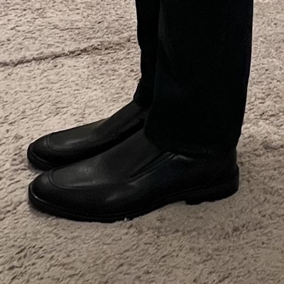 [This review was collected as part of a promotion.] These Good Fellow Toby Slip On shoe is a size 9.5 men’s. My husband typically wears either a 9 1/2 or a 10 depending on the brand. These shoes are true to size. They are a memory foam base - and are a black faux leather shoe that can be casual or dressed up. They are a slip on which is super nice and easy - he didn’t have to bend over or use a shoe horn. It’s about a 1 to 2 inch heel, which does add some dressy component to the look. They go great with jeans (as the picture shows) or dress pants. I received an incentive to write this review.