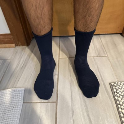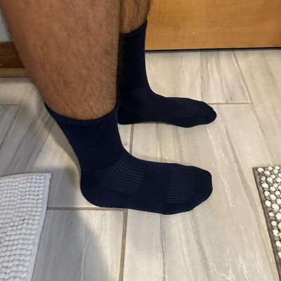[This review was collected as part of a promotion.] My husband is wearing these size 6-12 size socks. These socks come in a three pack and has two gray and one nanny blue color. These are mid length socks and are some of the softest socks my husband said he has ever put on. These can pass as dress socks or as casual with sneakers. These are a great pair of socks and it's wonderful that it comes in a three pack. My husband hasn't taken them off. I received an incentive to write this review.