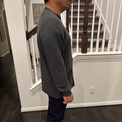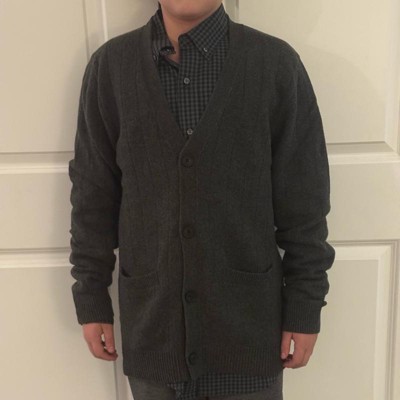 [This review was collected as part of a promotion.] This cardigan has a timeless, versatile style that makes it easy to dress up or down. The dark gray color goes with just about everything, and the v-neck with button down front gives it a polished, classic look. I really love the front pockets and ribbed detailing that give it a nice touch of style. I got this in a size small for my 13 year old son, and it fits him nicely with some room to grow into. I received an incentive to write this review.