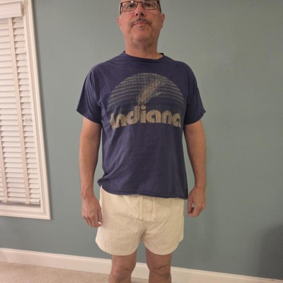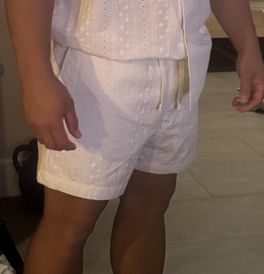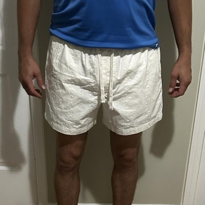 [This review was collected as part of a promotion.] I purchased these shorts online for my husband in size large. Large is his normal but these shorts were a bit big on him. He likes that they are lightweight and super comfortable. The length hits above the knee, giving a modern look without being too short. The elastic waistband makes them easy to slip on, and even though they a bit big they do have a drawstring to make them tighter in the waist. The subtle eyelet textured detail in the fabric adds a little style without being too much. The pockets are deep enough to hold essentials like a phone and wallet. The color is off white and the shorts are lined and not see through. I received an incentive to write this review.
