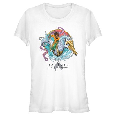 Aquaman is back in an all-new underwater adventure in the highly anticipated sequel Aquaman and the Lost Kingdom! Join Aquaman as he must team up with his brother Orm, the king of Atlantis, to protect their underwater kingdom from the evil Black Manta, with exciting new officially licensed apparel for the entire family! This Men's Aquaman and the Lost Kingdom Retro Pastel Poster Graphic T-shirt features a retro-inspired poster of Aquaman on a seahorse in pastel colors across the front.