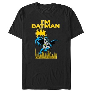 • Strut your stuff with this stylish new men's t-shirt that is perfect for every occasion! Featuring the iconic Bat-Signal illuminating the sky while Batman leaps into action, along with the statement: "I'm Batman" written in bold yellow lettering across the top.