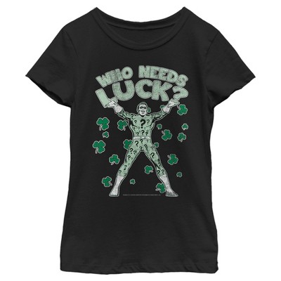 • This distressed design features the words "Who Needs Luck?" and The Riddler with green shamrocks all around him!