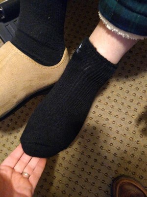 [This review was collected as part of a promotion.] My dad wears a size EEE shoe so finding socks that will fit his feet is a challenge. He also has stiff joints so getting socks past his heel to ankle a challenge as well. The xlg size fit his feet great. Getting past the heel to ankle a little. bit of work but doable. Perhaps with time this part will stretch a bit and be easier to get over the heel. But quality sock. His dementia prevents him from commenting and he has poor temperature control but he seems warmer