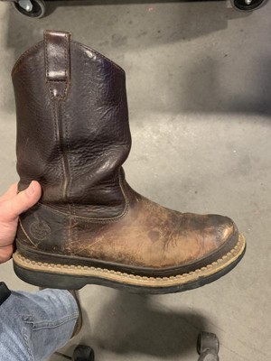 The Georgia Giant Wellington Pull-on work boot is the men's work boot you need. The soggy brown pull on work boot is comfortable and sturdy. It's exactly what you need in your day to day life.The men's leather work boots are 9 inches in height with a 14 inch calf circumference and is made with welt construction to ensure a long lasting boot, full-grain leather for a rugged look, and rubber outsole, for slip resistance in wet situations. In addition, the pull on boot has unlined quarters for flexibility in movement, and an oil resistant bumper guard to keep from tracking oil everywhere and to ensure that this brown men's work boot is tough enough for you. Comfort is key to any work boot which is why Georgia Giant Wellington Pull-on work has an internal padded collar to keep your ankle comfortable, a high performance lining to keep your foot at a stable temperature, an EVA midsole to keep long days from being too taxing on your feet, covered cushioned insole, and a steel shank for arch support.Try Georgia Giant Wellington Pull-on work for yourself! You won't be sorry.