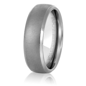 This classic men's titanium band ring evokes modern style and strength. The brushed center of the ring contrasts the beveled high polish edge, giving it a sleek appearance for the everyday man. The lightweight ring is built to last due to its titanium construction. The band has a classic design with a durable appearance. The lightweight titanium ring has a stylish design but may scratch if struck. The width of the domed band is 7 millimeters, and the thickness is 2.5 millimeters.
