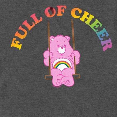 Welcome to the wonderful and adorable world of Care Bears! From cuddly stuffed bears to tv shows and movies, the Care Bears have it all! Grab yourself an officially licensed Care Bears design for the whole family today and spread a little joy! This Men's Cute and Colorful Graphic T-Shirt features the adorable fluffy Cheer Bear sitting on a swing with "Full of Cheer" printed in gradient text above her.