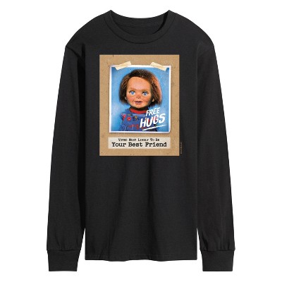 Chucky - Friendly, Wanna Play - Men's Long Sleeve T-Shirt - Unleash the terror of a horror classic with Child’s Play graphic apparel, featuring chilling designs inspired by the infamous killer doll, Chucky. From his innocent beginnings to his most sinister moments, each piece captures the twisted humor and slasher thrills of the cult-favorite film. Perfect for horror fans who like their scares with a side of mischief, this collection brings the nightmare to life in bold, unforgettable style.
