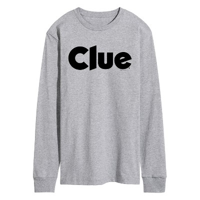 Clue - Clue Logo - Men's Long Sleeve Graphic T-Shirt - Dress to impress—with a little mystery—with Clue graphic apparel, inspired by the classic board game and its unforgettable cast of characters. Featuring bold designs of Miss Scarlet, Colonel Mustard, Professor Plum, and more, each piece brings the suspense, humor, and vintage charm of a good whodunit to your wardrobe. Whether you're a lifelong fan of the game or love a stylish nod to mystery, this collection is perfect for those who appreciate clever clues, dramatic reveals, and timeless intrigue.