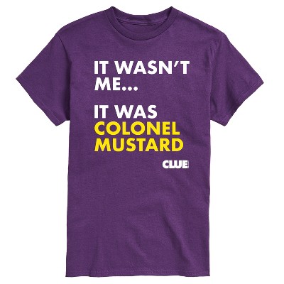 Clue - It Wasnt Me It Was Professor Plum - Men's Short Sleeve T-Shirt - Dress to impress—with a little mystery—with Clue graphic apparel, inspired by the classic board game and its unforgettable cast of characters. Featuring bold designs of Miss Scarlet, Colonel Mustard, Professor Plum, and more, each piece brings the suspense, humor, and vintage charm of a good whodunit to your wardrobe. Whether you're a lifelong fan of the game or love a stylish nod to mystery, this collection is perfect for those who appreciate clever clues, dramatic reveals, and timeless intrigue.