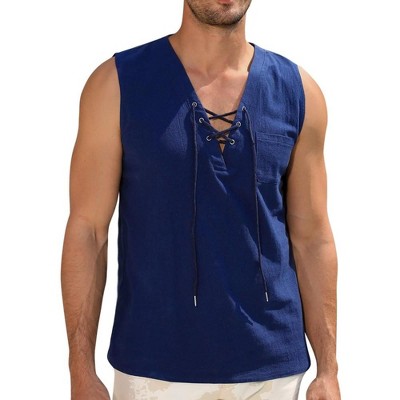 Men's Cotton Linen Tank Top Shirts Casual Sleeveless Lace Up Beach Hippie Tops Bohemian Renaissance Pirate Tunic