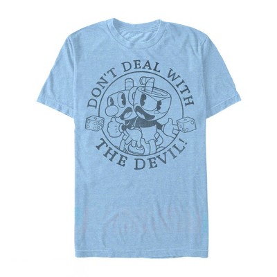 Head to the Inkwell Hell Casino in your finest Cuphead fashion with the Cuphead Retro Devil Deal Men's T-Shirt. A distressed scene portrays the Devil encircled by flames trying to tempt Mugman and Cuphead with "Cuphead Don't Deal with the Devil" across the front.