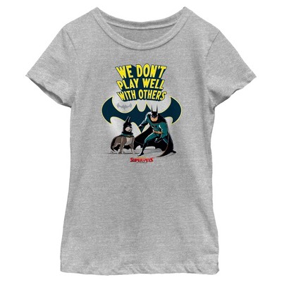 Get ready to join the DC League of Super-Pets as they master their own newfound powers and band together for a rescue mission to save their kidnapped best friends of the Justice League! This exciting new DC League of Super-Pets We Don’t Play Well With Others Men's Graphic T-Shirt features Batman and his pet best friend, Ace the Bat-Hound, in front of the Bat-Symbol with the phrase "We Don't Play Well With Others" printed across the top.